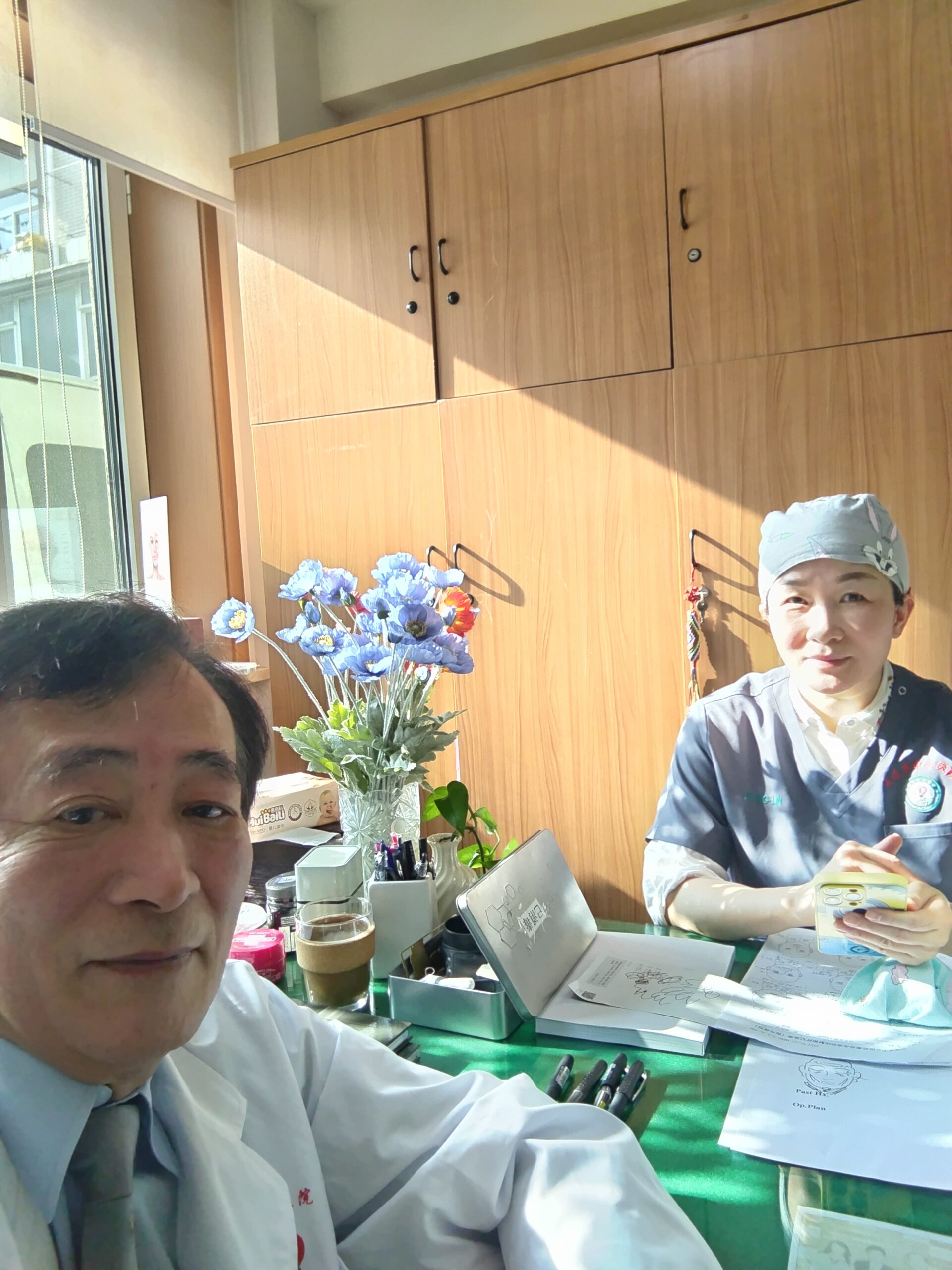 大連医科大学付属病院美容外科の部長の王先生の診療室で、待機しています。これから来院の患者さんの診察をおこないます。