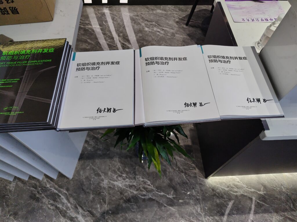今年発刊された「軟部組織への注入剤による合併症」のの内側の1ページ目に、私の署名をしました。後で、共著者の王先生の署名もはいります。200冊ほど署名しました。